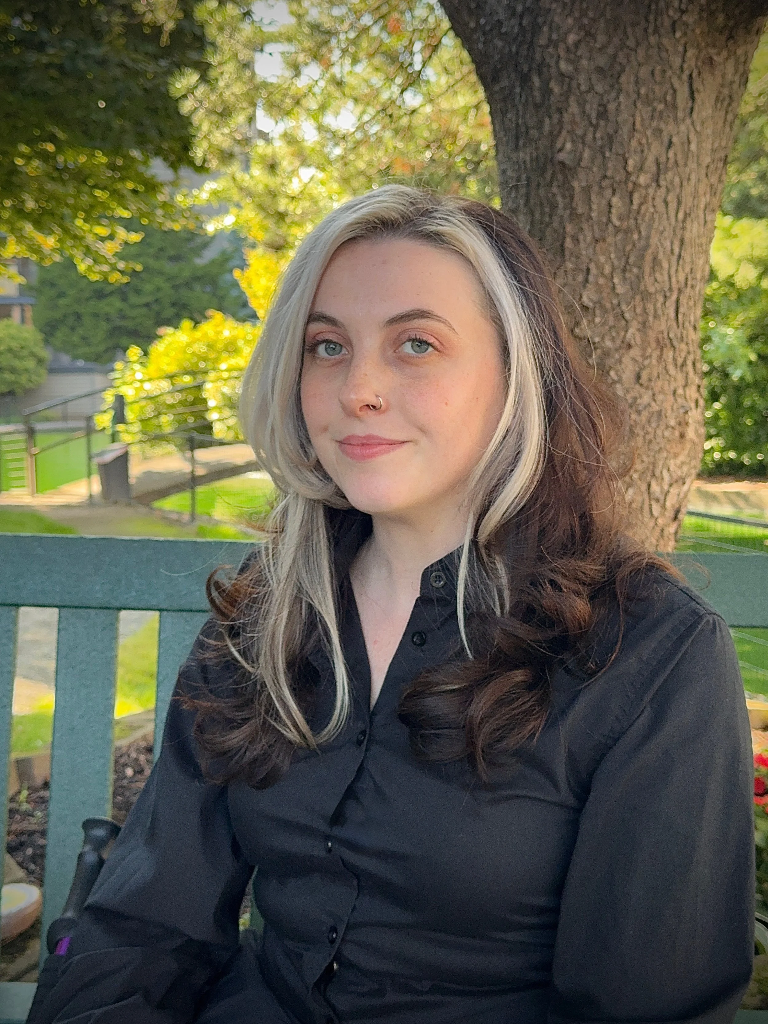 Dawn has long wavy dark brown and platinum blonde hair, is wearing a black button-up shirt, and is sitting on a green bench outdoors with trees and greenery in the background.
